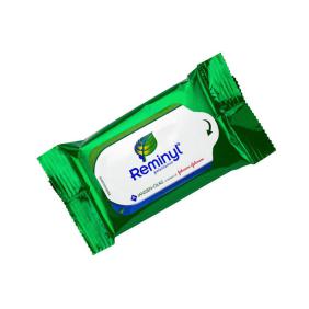 10 moist wipes in mini flow-pack with f/c printed label |