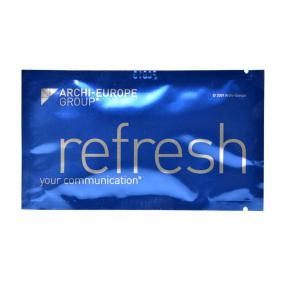 Personalized, promotional wet wipes printed with your logo. Refreshing wipes, santizing wipes, screen cleaning wipes. The ideal tool for your sales promotion or direct marketing campain