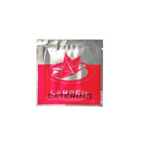 Our most premium packaging option for refreshing towels or liquid sachets has an aluminium coating which gives a very luxury appearance. Very well suitable for premium brands or messages. The sachet are printed on both sides in any Pantone colour for a maximum exposure.