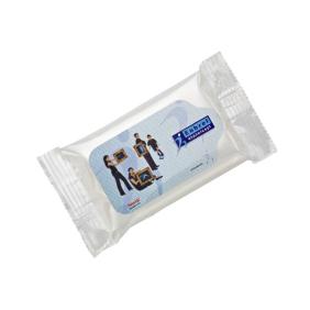 10 moist wipes in mini flow-pack with f/c printed label |